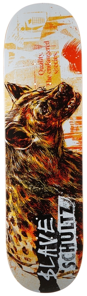 Slave planche skateboard Wild Life Schultz 8.5 : avec grip Mob 9' classique offert, grippée par nos soins*. Cette planche de skateboard Slave est fabriquée en érable à 7 plis pour une robustesse optimale. Connue pour son design artistique et original, elle reflète l'esprit créatif de la marque. Avec un concave bien défini, cette planche offre un excellent pop et un bon contrôle, idéale pour les skateurs de tous niveaux cherchant à allier performance et style.