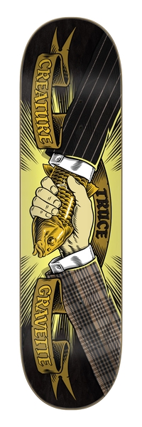 Creature planche skateboard Gravette Truce 8.3 X 32.2 : avec grip Mob 9' classique offert, grippée par nos soins*. La planche de skateboard Creature se distingue par son esthétique originale et son esprit dark. Fabriquée en érable canadien ultra robuste, elle offre durabilité et un pop puissant, parfaite pour les skateurs engagés en street, park ou bowl. Son design saisissant, souvent inspiré d’univers macabres, en font un choix emblématique pour les riders au style affirmé.